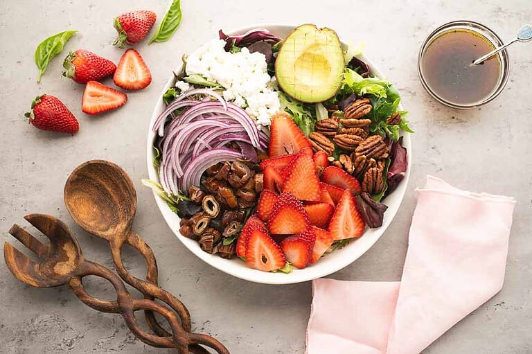 - Toss the arugula with a pinch of salt and pepper in a large bowl. Add in the strawberries, avocado, goat cheese, pistachios, and sugared almonds. Drizzle on the dressing and toss well. Serve immediately!